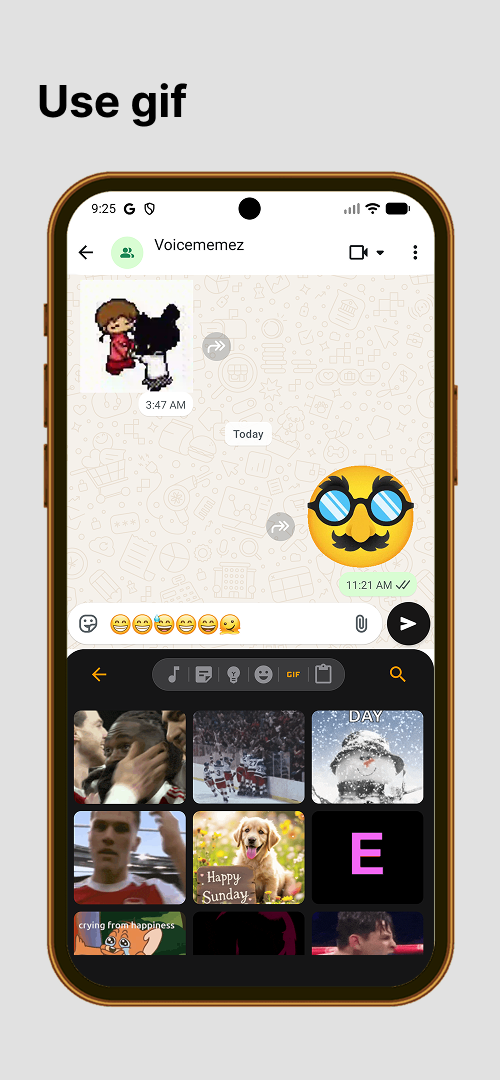 Browse and send WhatsApp stickers directly from the keyboard. Custom packs, animated stickers, and more.